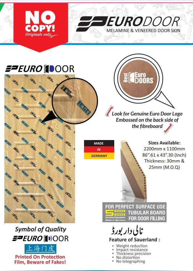 میلامین پیسٹنگ ڈور — مضبوطی، اسٹائل اور شاندار کارکردگی کا بے مثال امتزاج۔ اعلیٰ معیار کے چائنیز پلائی (Chinese Ply) سے تیار کردہ یہ دروازہ جدید کلفٹن ڈیزائن کے ساتھ کسی بھی کمرے کو دلکش اور جدید انداز بخشتا ہے۔